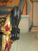 This magnificent tomb is of Sir Richard Mompesson (d1627) and his third wife Katherine (d.1622). The colours are tremendous, but not original as the tomb was overpainted in the 1960s.(1) A coat of arms in its original colours, now somewhat faded, has been found on the underside of the tomb, showing how it was originally coloured. (2)