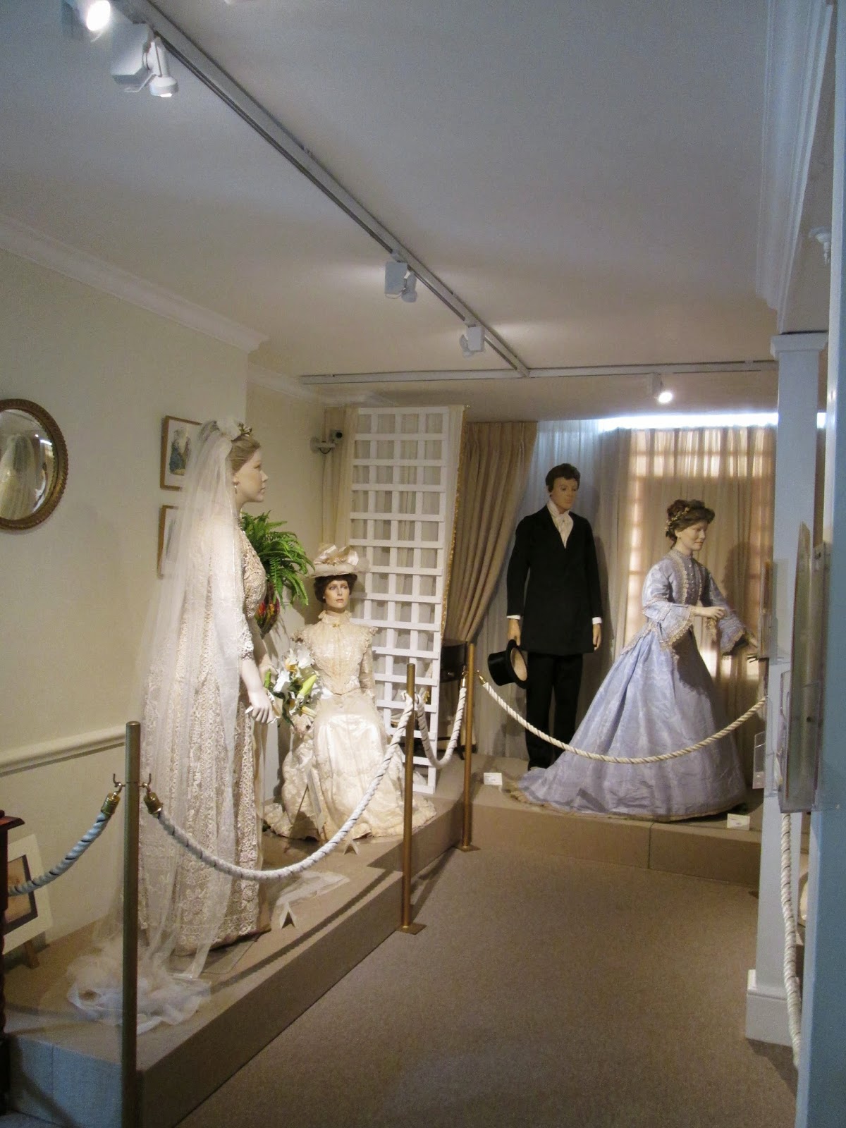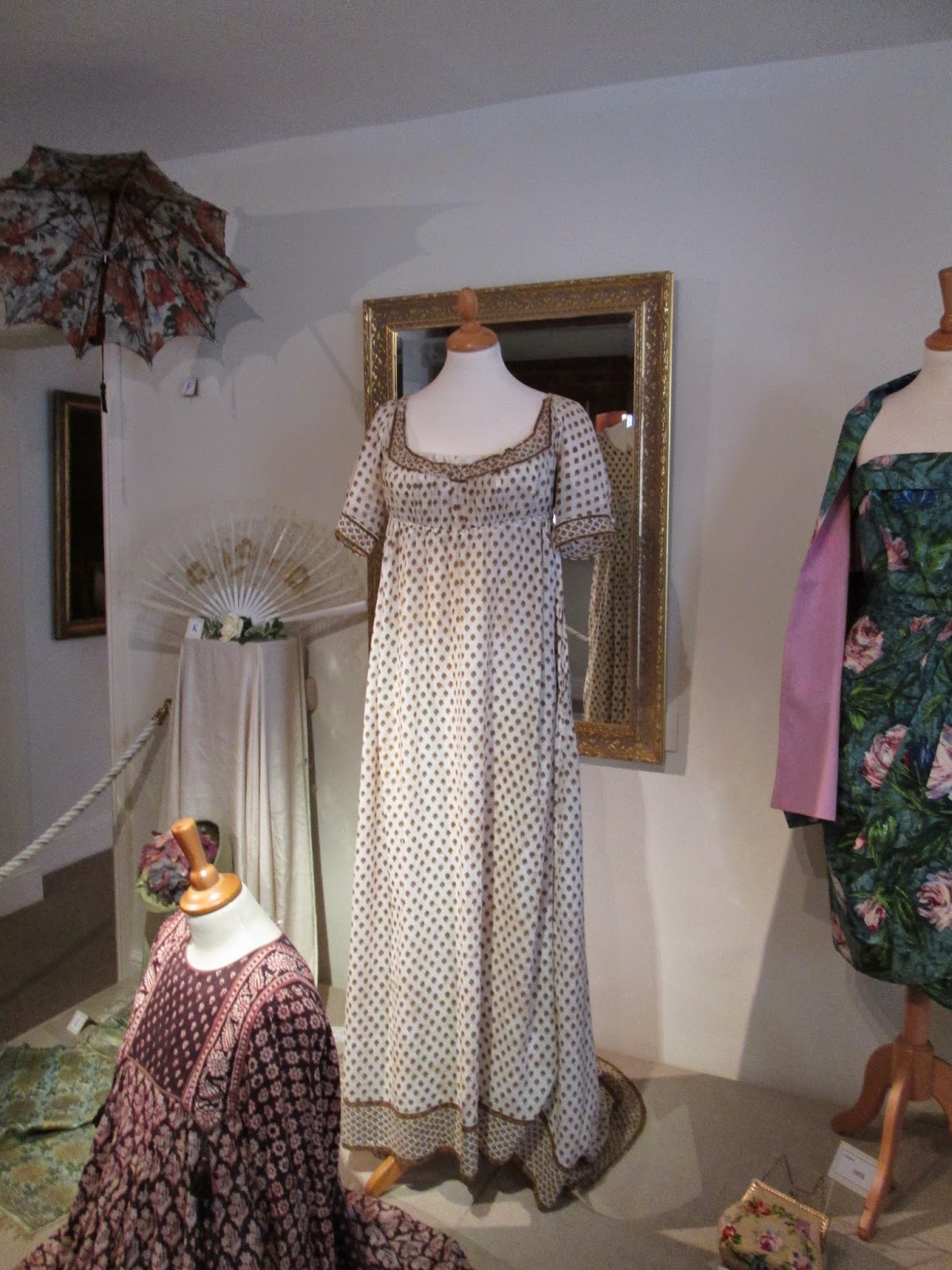 The garments are arranged sometimes by theme and sometimes by period. The collections start with the mid 18th century, in Room 2 done out as a Georgian parlour, and go up to the 1980s, Room 8 contains three Frank Usher outfits from the 1970s and 1980s. There are two rooms with exhibitions that change on a regular basis. At the moment there are two exhibitions, Blushing Brides (Room 3), and Passion for Pattern (Room 7). Blushing brides contains 19th century wedding dresses, some of which have original documentation including photographs of the dress being worn by its original owner. Passion for fashion covers the whole period of the collection, and all types of patterned garments.